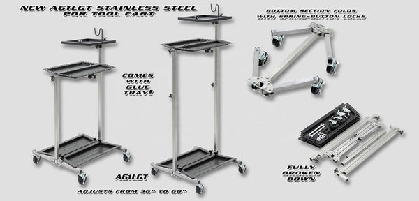 A61LGT - Ultra Lightweight Stainless PDR Tool Cart w/Glue TrayAll Stainless, weighs 23lbs.Comes with Locking Casters, Glue Tray adjusts 21' in height', and 4 ABS tool trays and hardware.Breaks down...